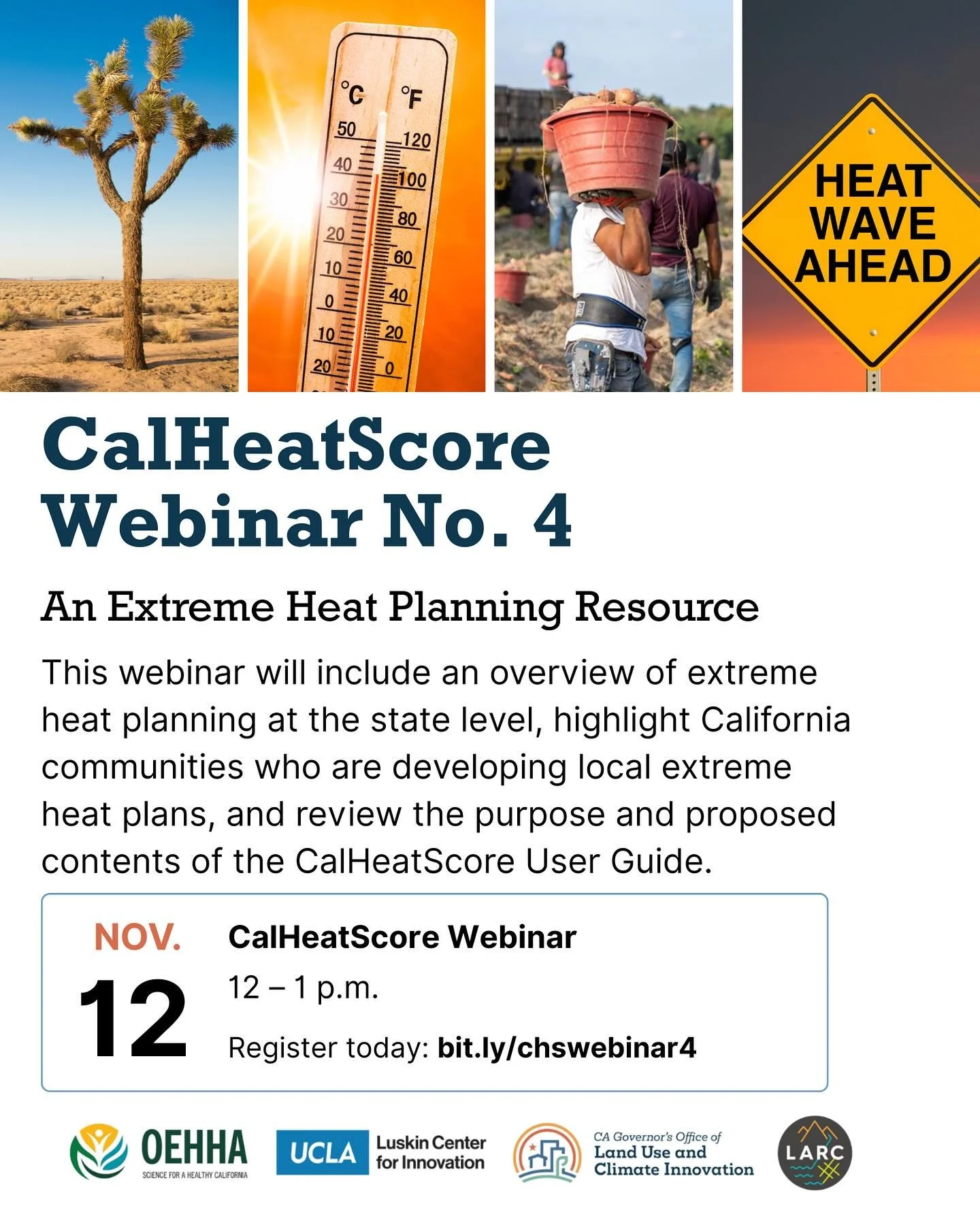 On Nov 12, 2025 12:00-1:00, please join us for the fourth webinar in a series of six that will focus on the newly released CalHeatScore tool.