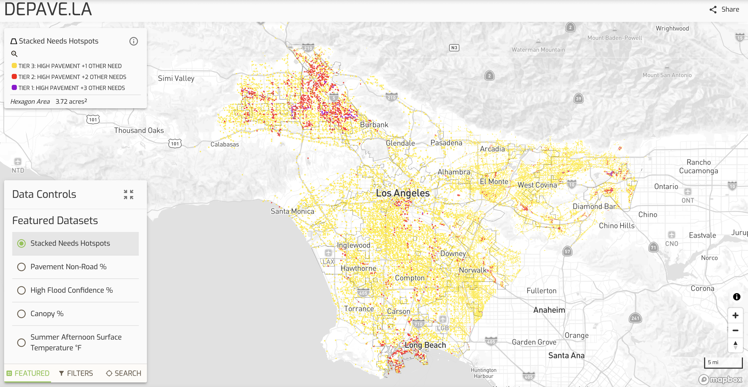 To learn more about Depave LA, visit their website and explore the interactive data viewer, which features a detailed map of Los Angeles County and highlights stacked needs hotspots through adjustable layers, boundaries, and categories.
